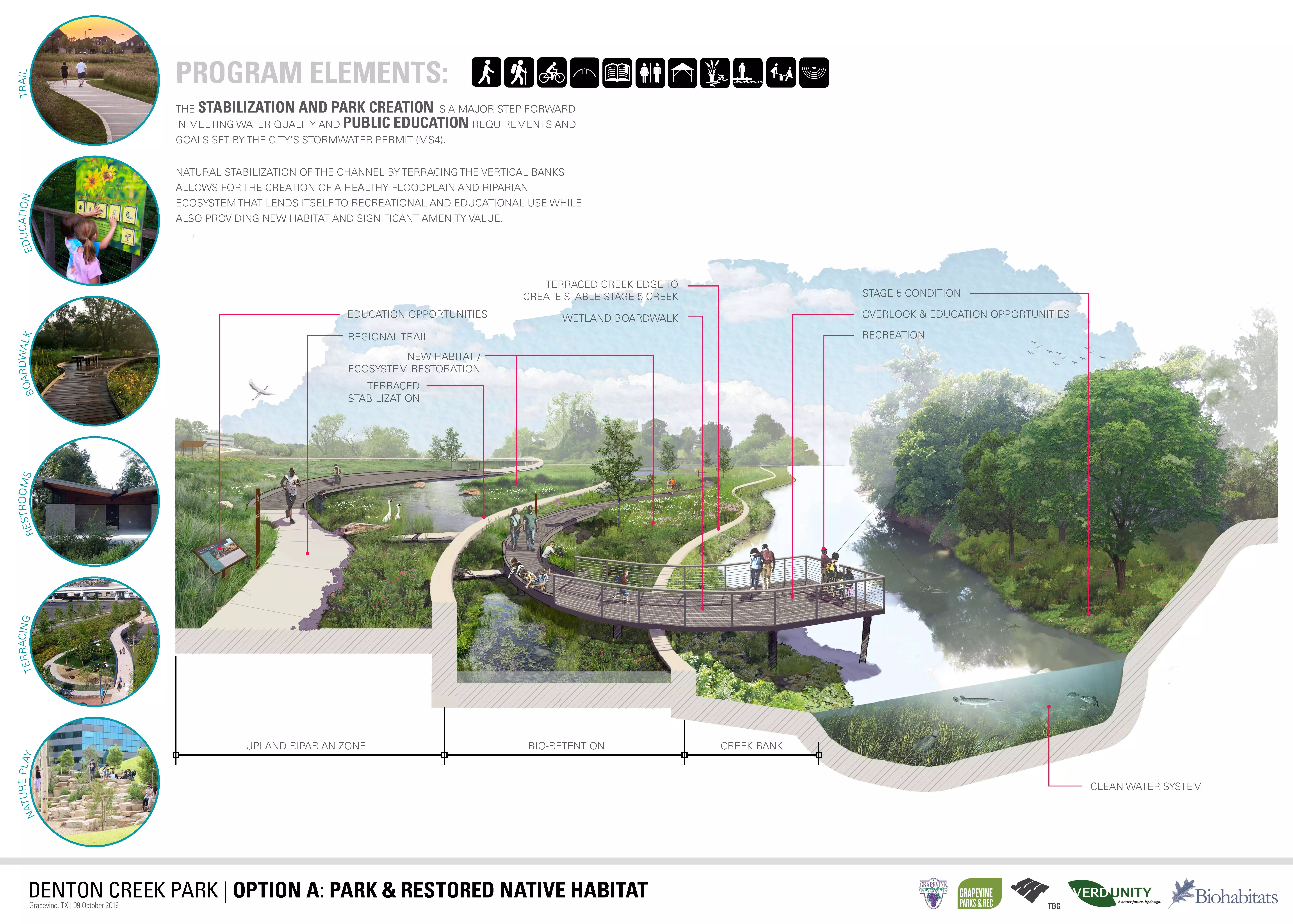 Denton Creek Park is a forward thinking sustainable project that provides unique recreational and educational opportunities while creating a stable creek channel and a healthy floodplain and riparian ecosystem with significant amenity value to the Grapevine community. The creek stabilization and park creation is a major step forward in increasing water quality and public education.